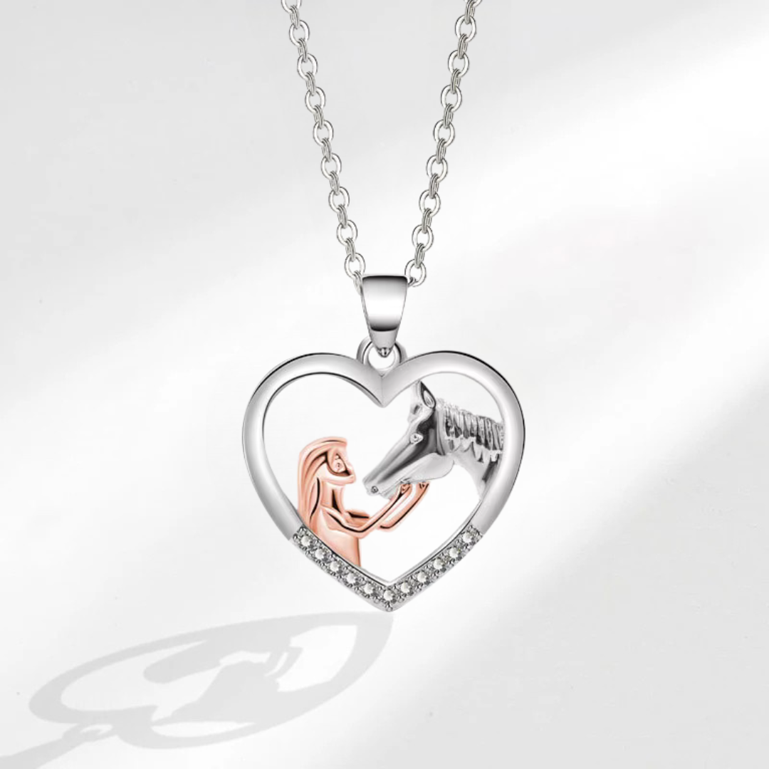 Det vackra hjärtformade hänget visar en flicka och hennes häst i ett ömt ögonblick – en påminnelse om bandet som aldrig bryts.